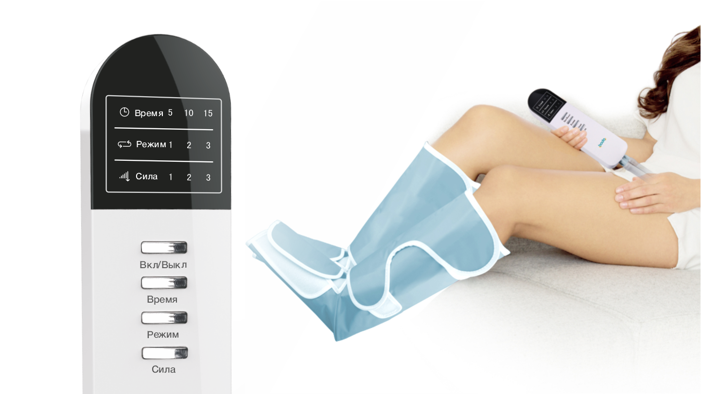 Лимфодренажный аэромассаж снимает усталость, уменьшает отеки за счет ускорения метаболизма и оттока межклеточной жидкости, благотворно влияет на состояние всего организма. Выберите 1 из 3 режимов аэромассажа.